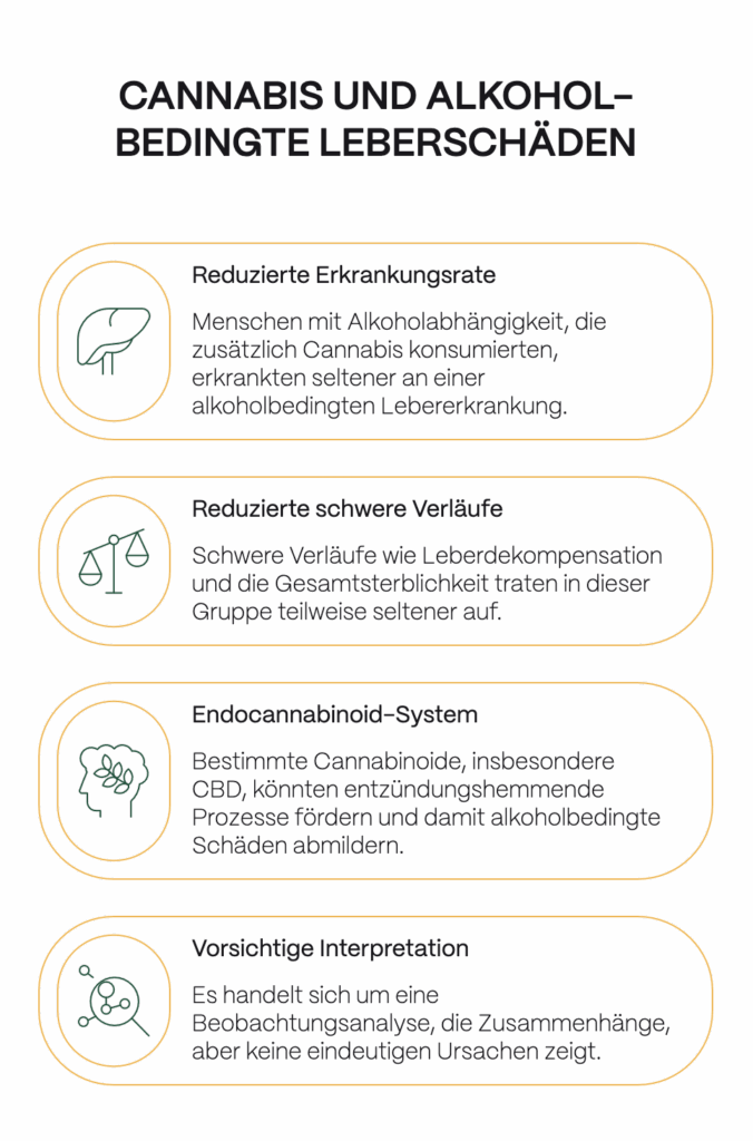 Eine weitere aktuelle Studie lenkt den Blick auf einen bislang wenig beachteten Zusammenhang: den Einfluss von Cannabis bei alkoholbedingten Leberschäden. In einer großen Auswertung von Patientendaten zeigte sich, dass Menschen mit Alkoholabhängigkeit, die zusätzlich Cannabis konsumierten, seltener an einer alkoholbedingten Lebererkrankung erkrankten als vergleichbare Personen ohne Cannabiskonsum.[4] Auch schwere Verläufe wie Leberdekompensation und die Gesamtsterblichkeit traten in dieser Gruppe teilweise seltener auf.[4]